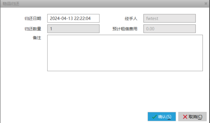 当客人归还租借物品后,可以通过归还功能,处理客户的归还。选中对应的记录,点击归还后在弹出来的窗口中确认归还数量,并在备注记录相关情况。