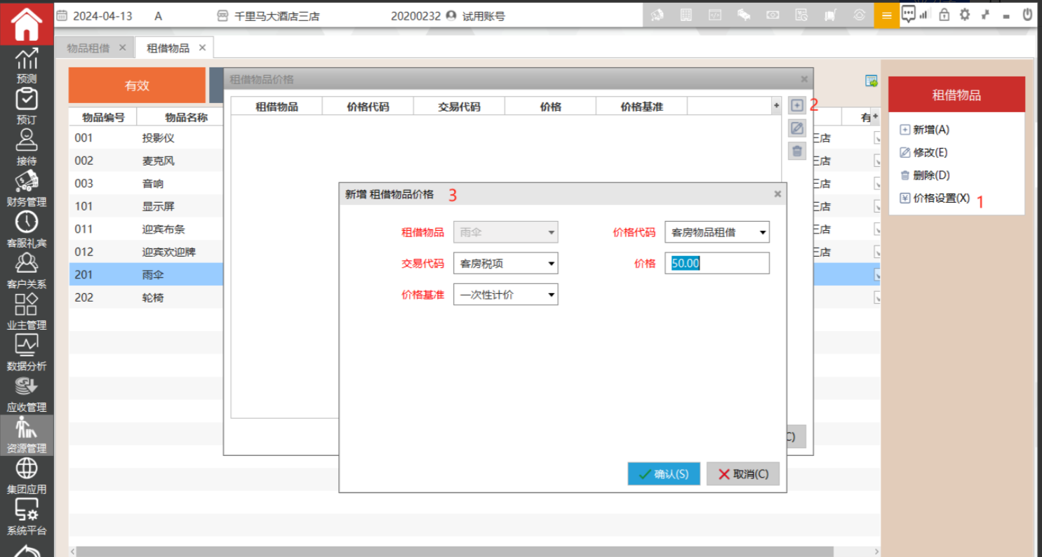 首先定义客房的租借物品,然后在客房管理中的租借物品中登记租借情况。