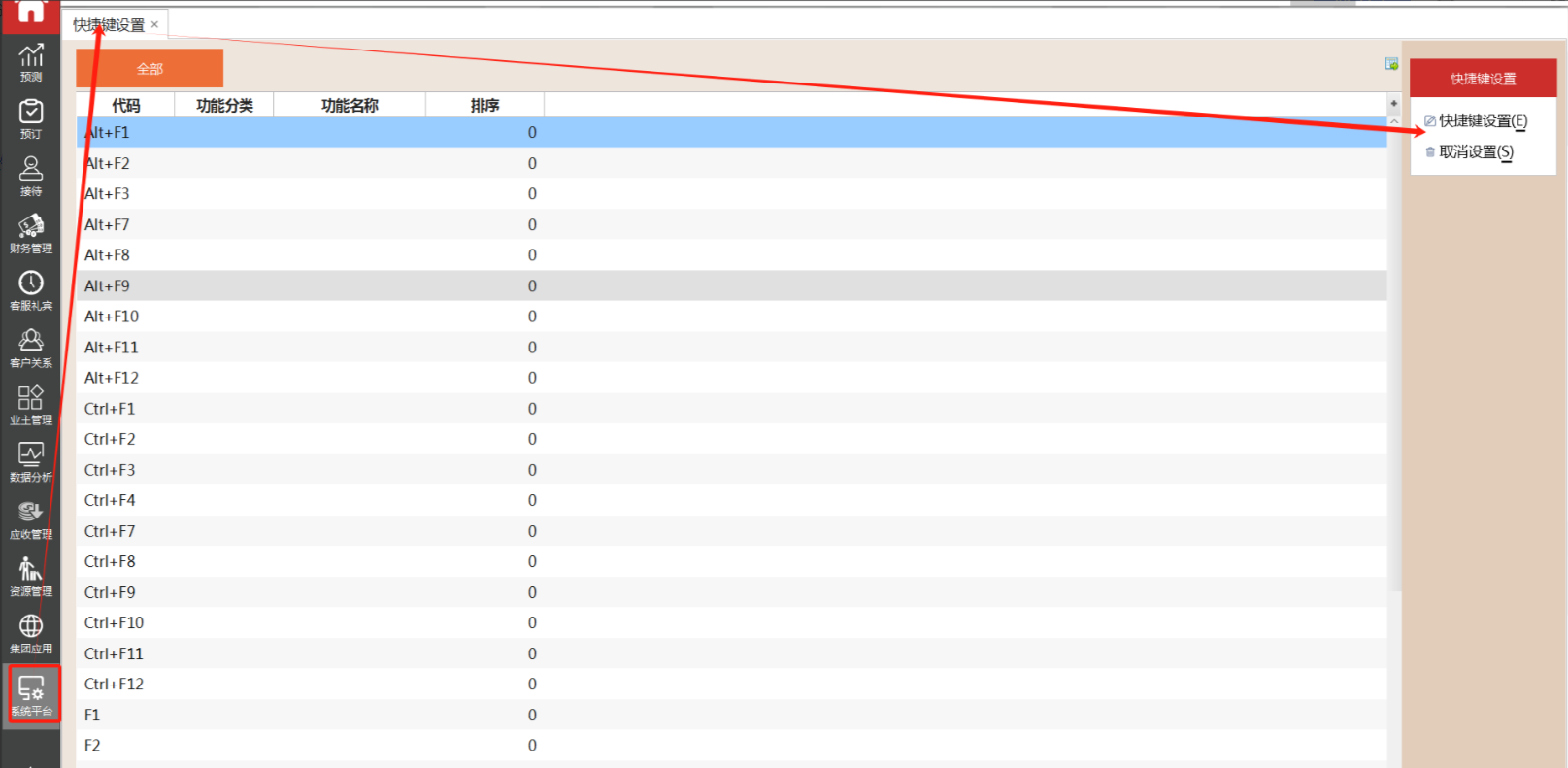 在组织单元中通过“系统配置”--“快捷键设置”功能选项中,设置对应的快捷组合键,如图所示