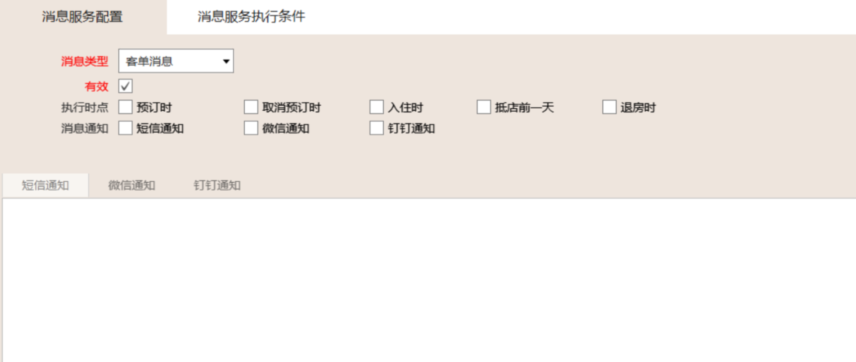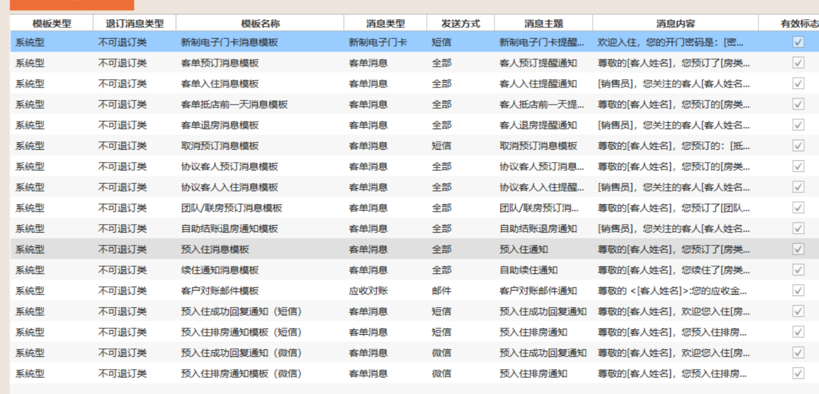 消息列表 消息管理是针对客人预定、入住、退房等给客人推送消息,提升对客人的服务质量。 消息模板 设置按照自己定义的内容预定、入住、退房等消息给客人。 消息服务配置 设置执行时间、消息通知