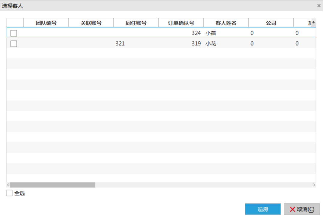 点击退房按钮可办理客人的结账退房操作。点击取消按钮则夜核过程终止。