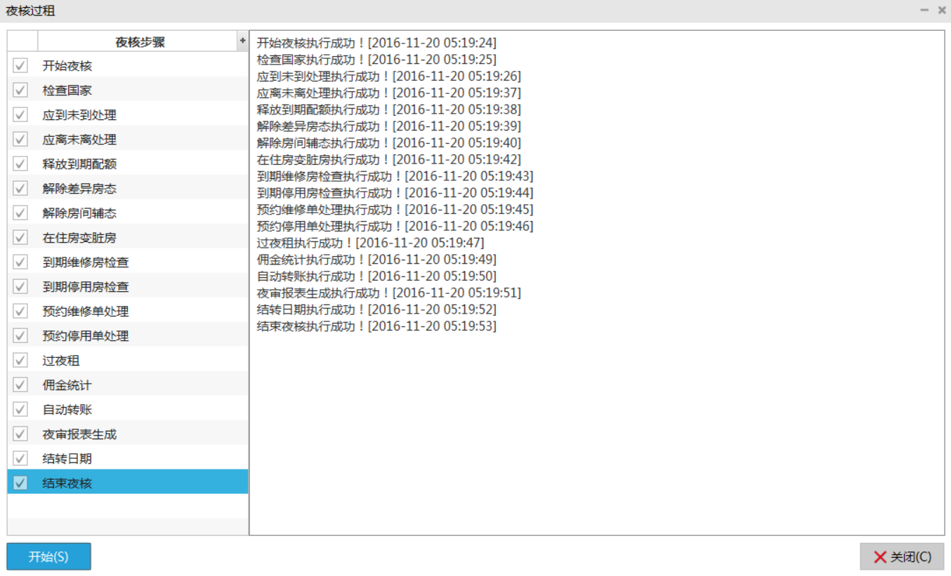 夜间稽核或审核是在一个营业日结束后,对所有发生的交易进行审核、调整、对账,计算并过入房租,统计汇总,编制夜核报表,备份数据,结转营业日期的一个过程。夜核的使用界面与收银的结账退房非常类似。左边列出了夜核中要完成的一系列工作步骤。右边记录每一步骤完成的情况和时间。左下角的交通灯表示当前进展,红灯表示当前步骤遇到异常情况需要处理,绿灯表示顺利通过,黄灯表示结束夜核工作。点击“开始”按钮就可启动夜核进程。