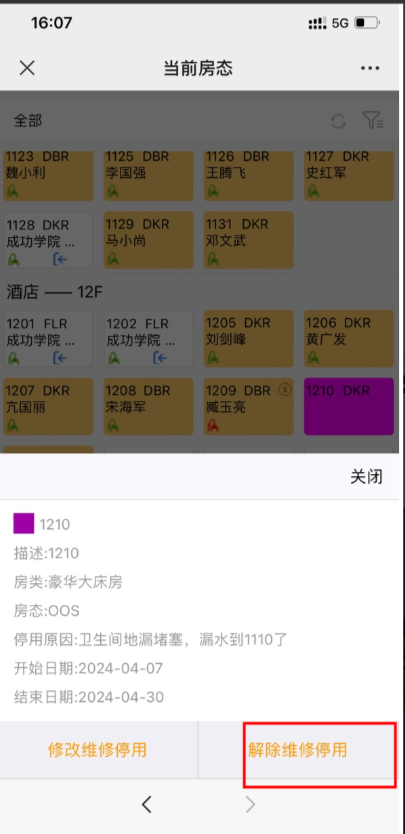 1、选中已经设置的维修、停用房后可以选择解除维修停用