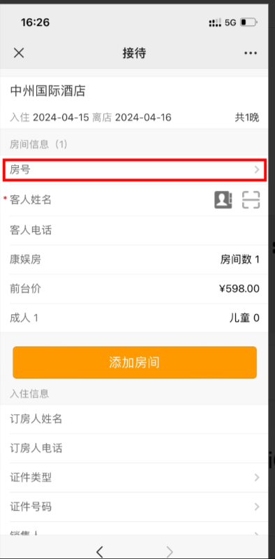 一、进入手机工作圈后打开IPMS中的散客步入 1、弹出界面中选择对应的房类、房价 2、填写房号、客人信息和订房人信息后保存即可