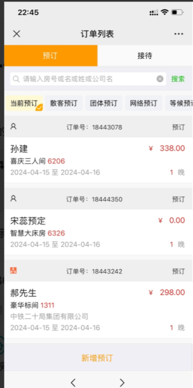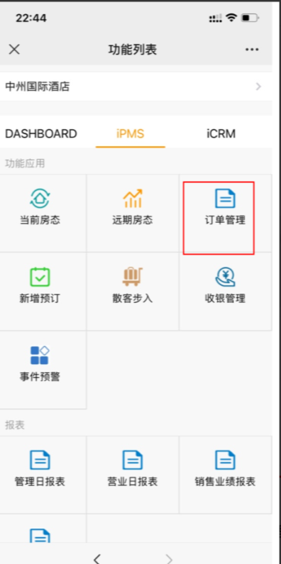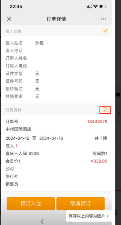 一、进入手机工作圈后打开IPMS中的订单管理,查看订单状态 二、选择要修改的预定或在住客单 三、选择订单资料右上角的修改标志 四、修改客人信息后保存即可