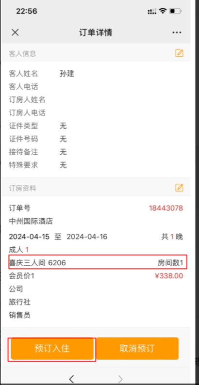 三、订单详情下方的预定入住即可