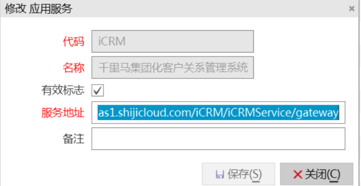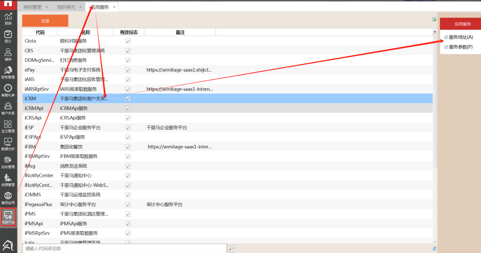 在组织单元中通过“系统平台”--“应用服务”功能选项中,选择和配置对应的服务地址和服务参数,如图所示