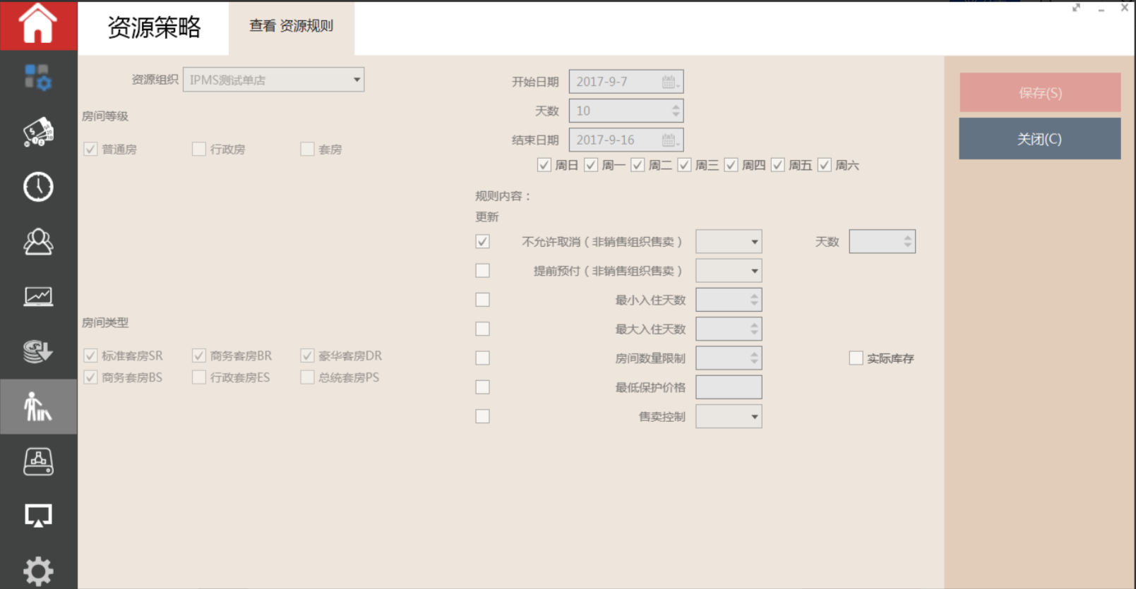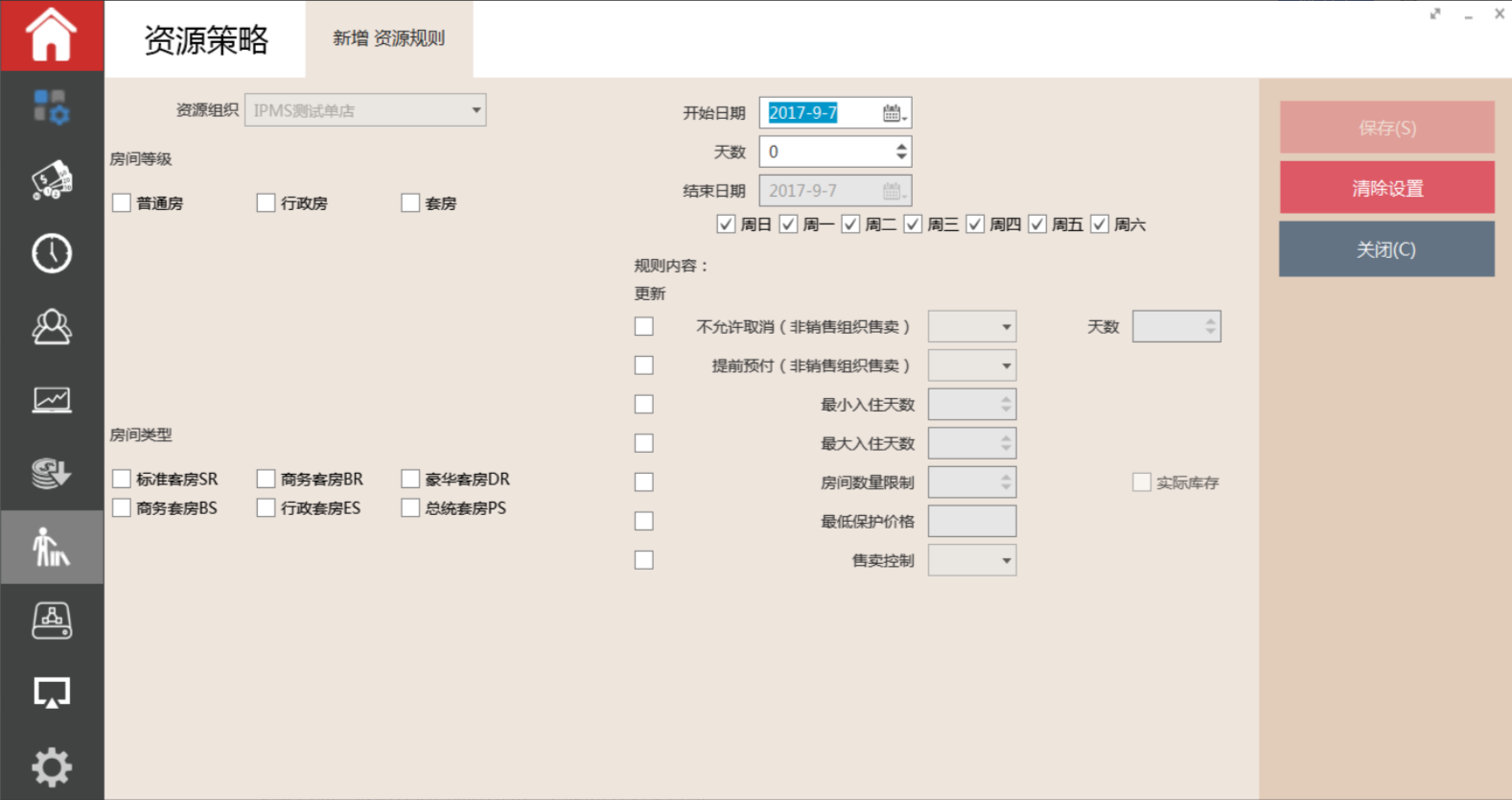 房间数量限制:控制当前资源组织+当前房类+当前日期中,来源于非销售组织直接售卖的渠道订单所能达到的最大的房间数量占用限额;若勾选‘实际库存’,则表示非销售组织直接售卖的渠道所享受的房间数量占用上限额为使用实际资源组织的可用库存。