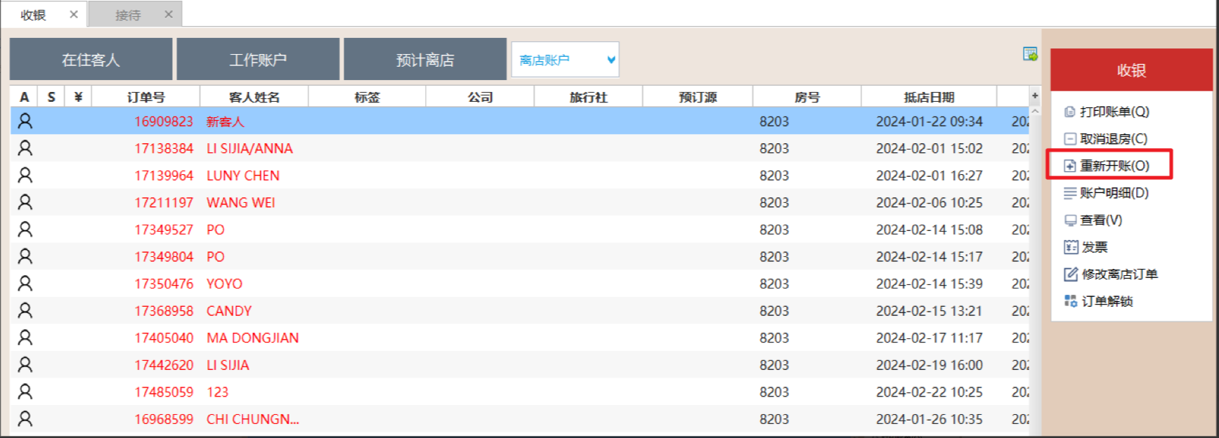 “重新开账”功能在相关视图中可以找到。例:已结未退视图、离店账户视图、历史账户视图。在住账户视图不显示“重新开账”功能。
