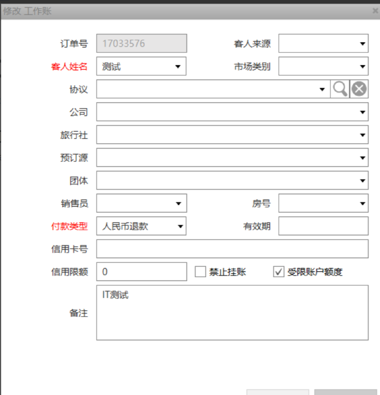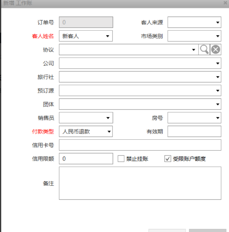 新增工作账时,一般要输入客人姓名和结算方式,如果还涉及到销售协议、公司/旅行社等资料,请一定要将其补充完整,因其将影响协议等报表的统计。一般工作账立开立结,不宜保留过长时间。