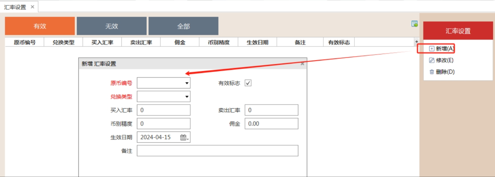 登录ipms组织单元-资源管理 -财务类代码-汇率设置-新增