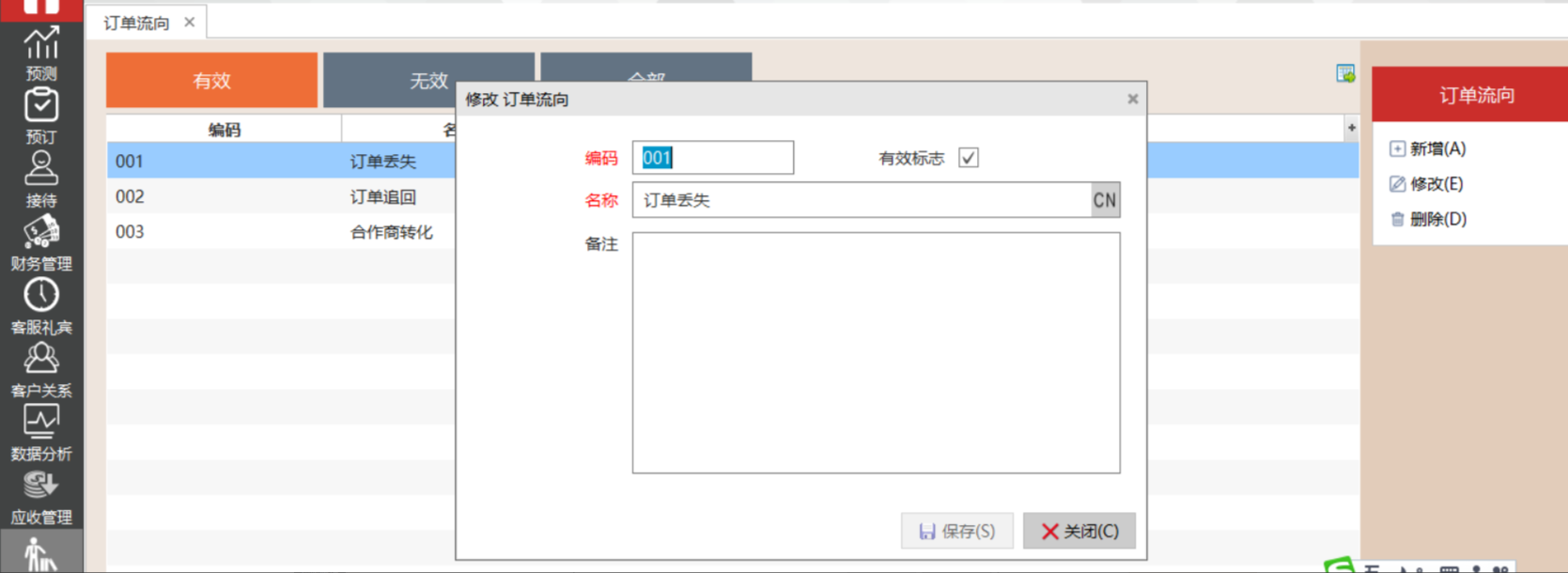 2.进入订单流向页面后右边有、增加、修改、删除功能。