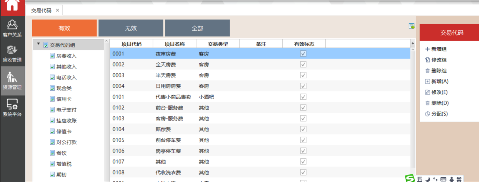 交易类型:交易类型用于有类似交易代码。此字段是可选项,但是,某些财务报表是以交易类型为基础。类型包括住宿、餐饮、电话、迷你吧、税务、非收入、其他或空白。