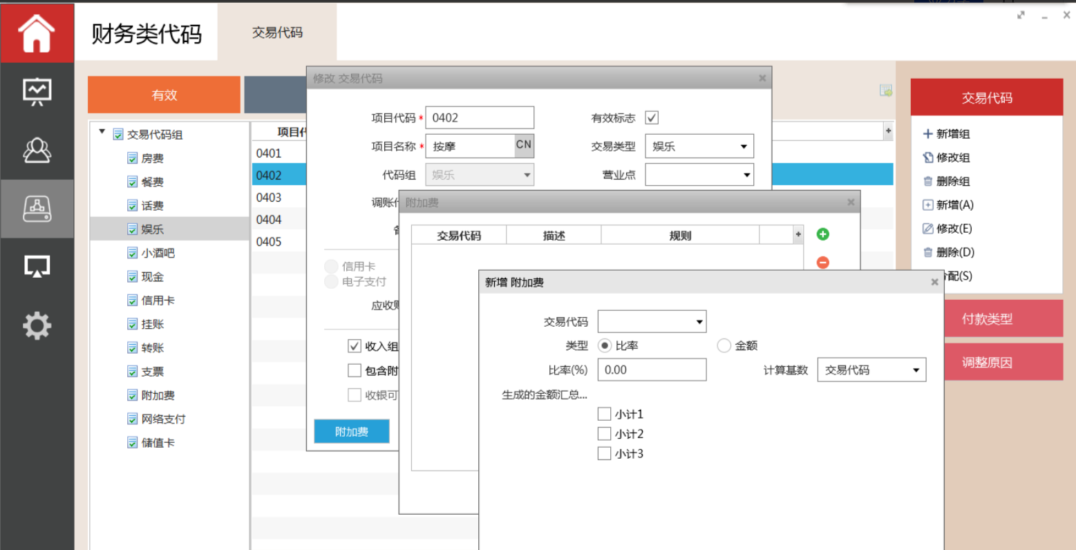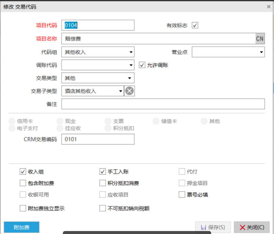 包含附加费:包含由该交易代码所产生的附加费用(如:税、服务费等)。含税销售额 = 销售额 * (1+税率)。例如,一个迷你吧费用是包含税,所以,当入账该项交易代码时,如果消费了含税40块(附加费是设置的10%),客人在账单上看到是40,但事实上,内部的税已包含:40/(1+10%)=36.36块钱的迷你吧、3.64块钱的税。