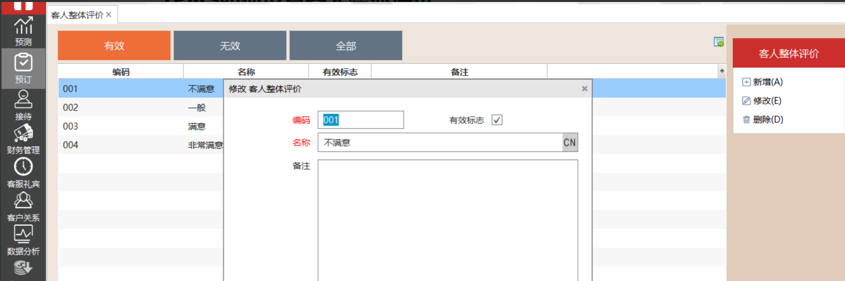2.进入客人整体评价页面后右边有、增加、修改、删除功能。