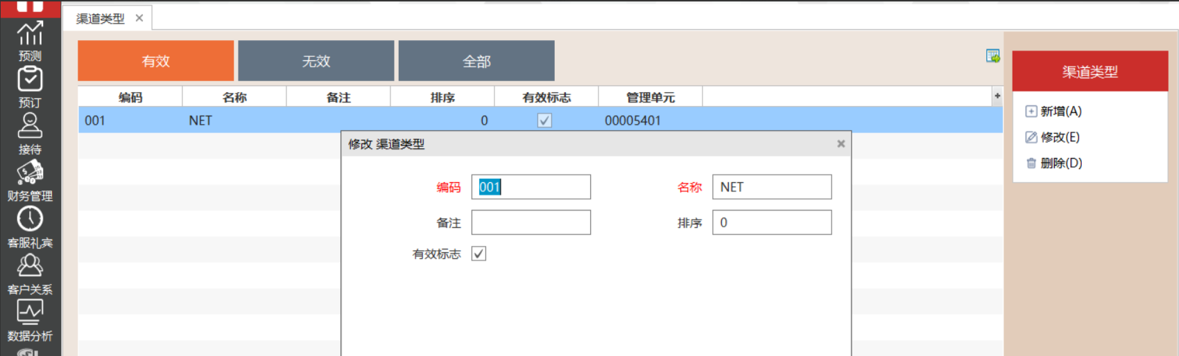 2.进入渠道类型页面后右边有、增加、修改、删除功能。