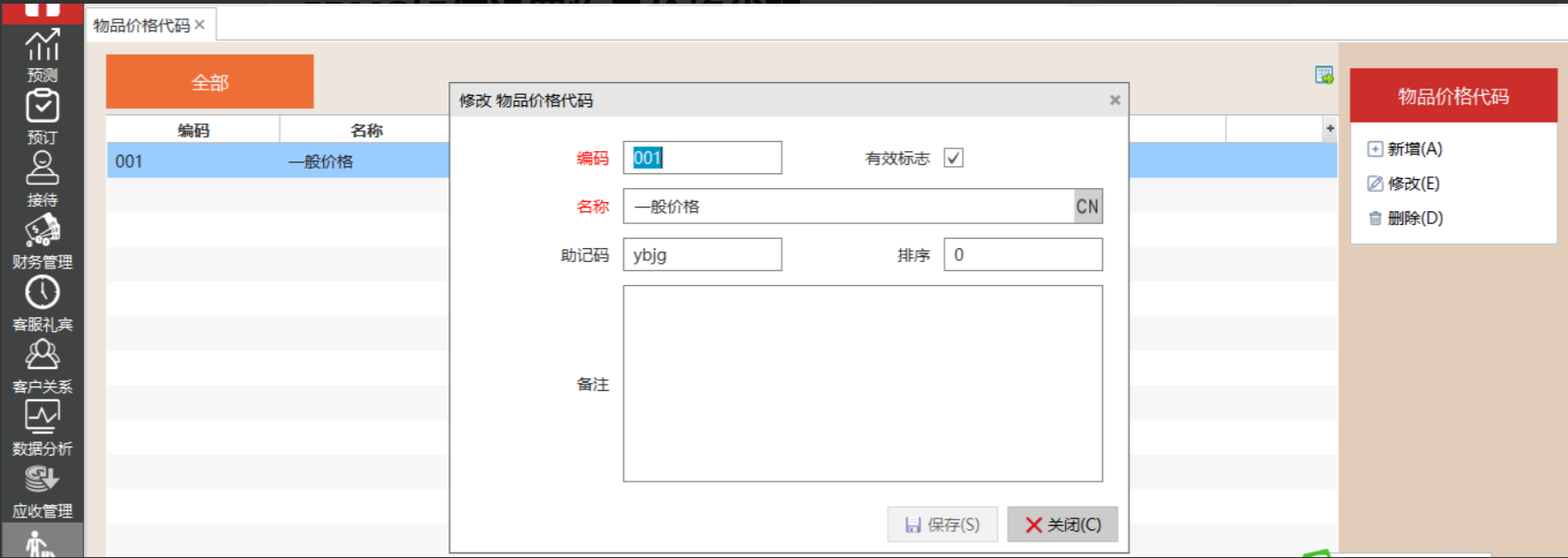 2.进入物品价格代码页面后右边有、增加、修改、删除功能。