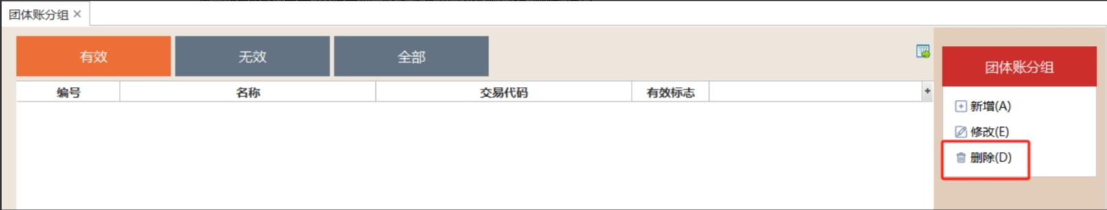 登录ipms组织单元-资源管理 -财务类代码-团体帐分组-删除-保存