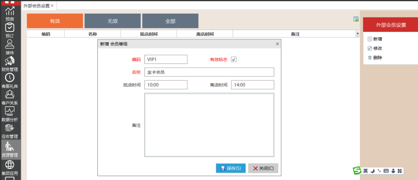 1.登录IPMS组织单元,在左侧选择资源管理-营销类代码-外部会员设置。2.进入外部会员设置页面后右边有、增加、修改、删除功能。备注:此功能为对接第三方会员,实现会员权益。编码为第三方会员级别编码,抵店、离店时间为第三方会员的权益。