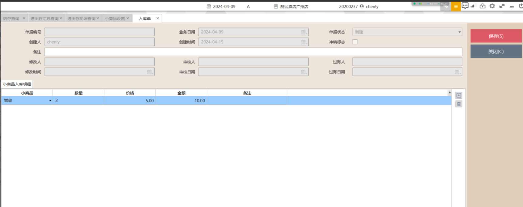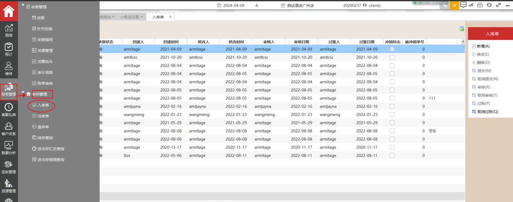 进入财务管理下的库存管理,选取“入库单”菜单,即可新增入库单,同时也可以对入库单进行修改、删除、审核及过账等操作。 注意:入库单必须过账才影响小商品的库存变化,同时相关报表才体现入库数量。
