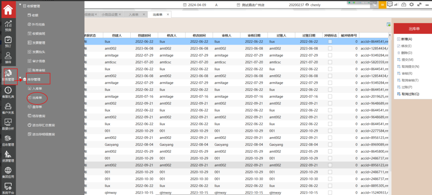 进入财务管理下的库存管理,选取“出库单”菜单,即可新增出库单,同时也可以对出库单进行修改、删除、审核及过账等操作。 注意:出库单必须过账才影响小商品的库存变化,同时相关报表才体现出库数量。