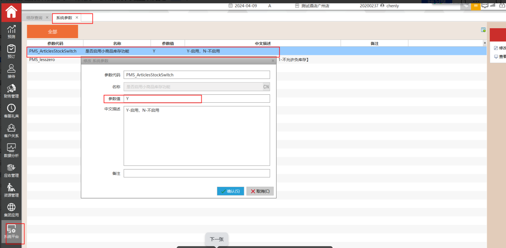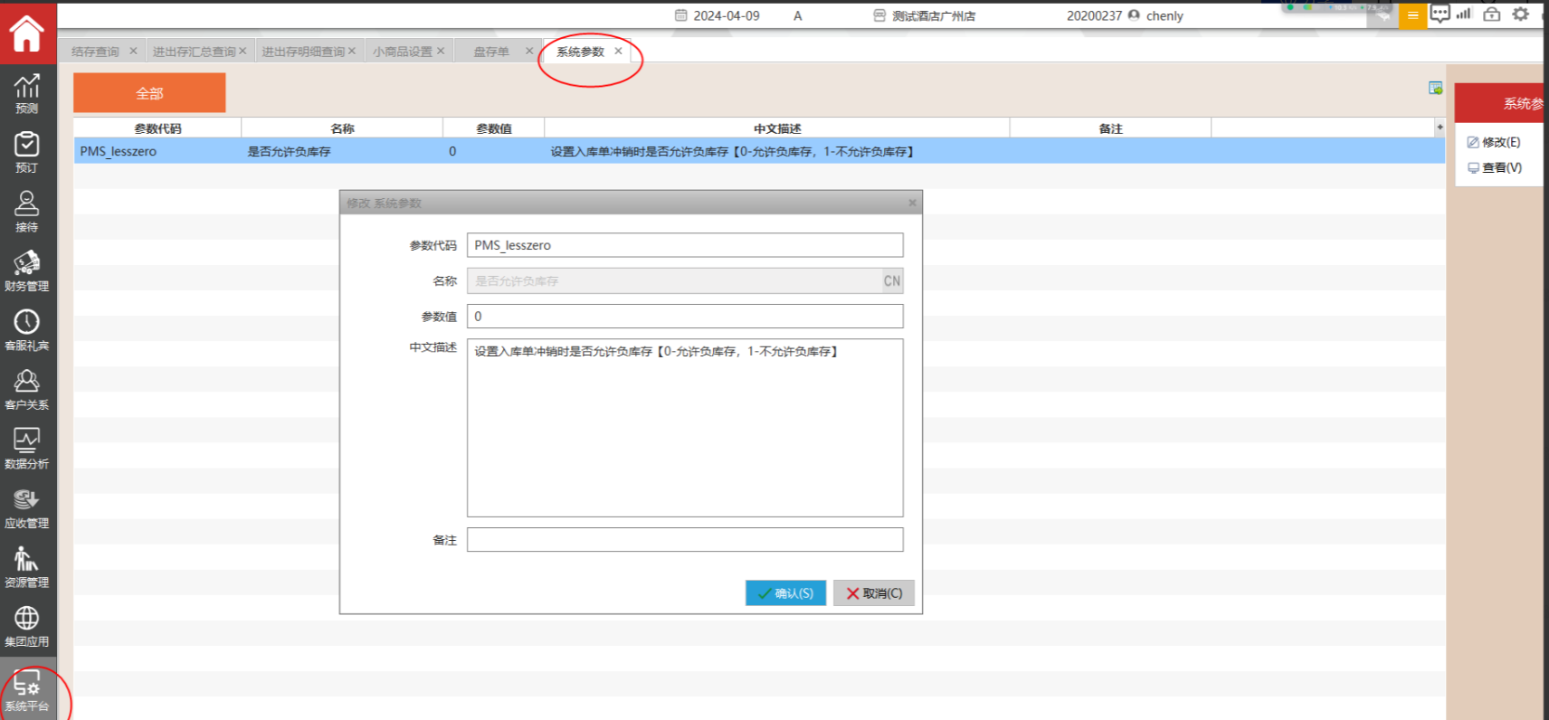 同时对于是否需要按结存才能做出库的情况,例:结存数为2,客房销售或出库时,数量为 3, 此种情况系统提供参数“出库不检查结存情况”控制,取值范围控制是/ 否,当此参数 = 是时,上述情况则允许出库(会造成负库存),当此参数 = 否时,上述情况不允许出库。
