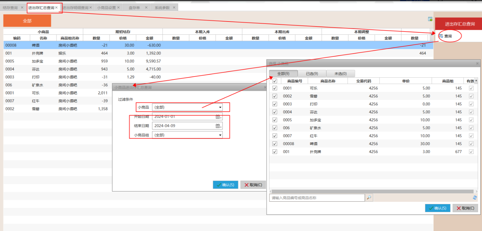 用于酒店在未设立独立仓库管理的情况下,通过前台部门中对酒水等商品进行基本进出存管理。在现行的经济型酒店(包括连锁或独立型酒店)中,绝大部份酒店只以客房为主营,不再涉及附属项目的经营,因此,对于物品的管理要求及涉及的明细种类大大降低及减少。物品管理的种类可分为:经营用耗用品、办公用品、消费商品等,其中办公用品等属于二线内部管理范畴,而消费商品直接与一线营业相关,故此类型酒店期望消费商品部份可通过前台营业系统直接进行管理。