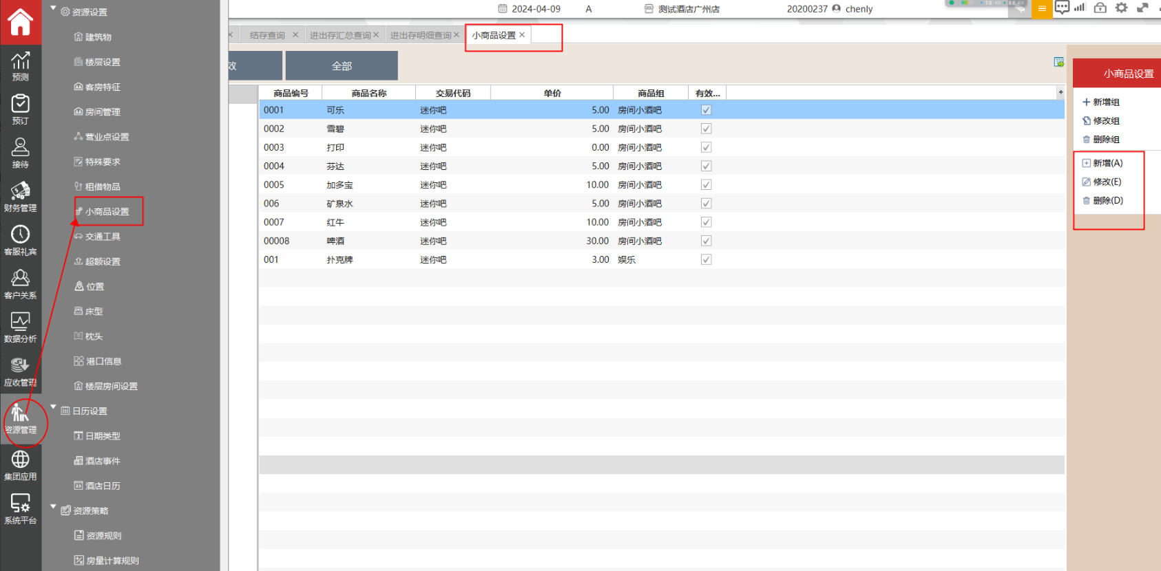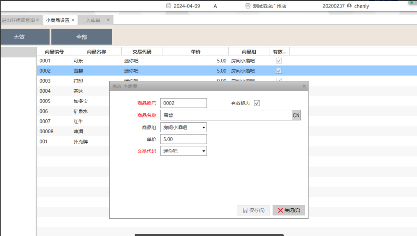 为进行小商品库存管理,要先设置酒店需管理的小商品,包括编码、名称、单价等。