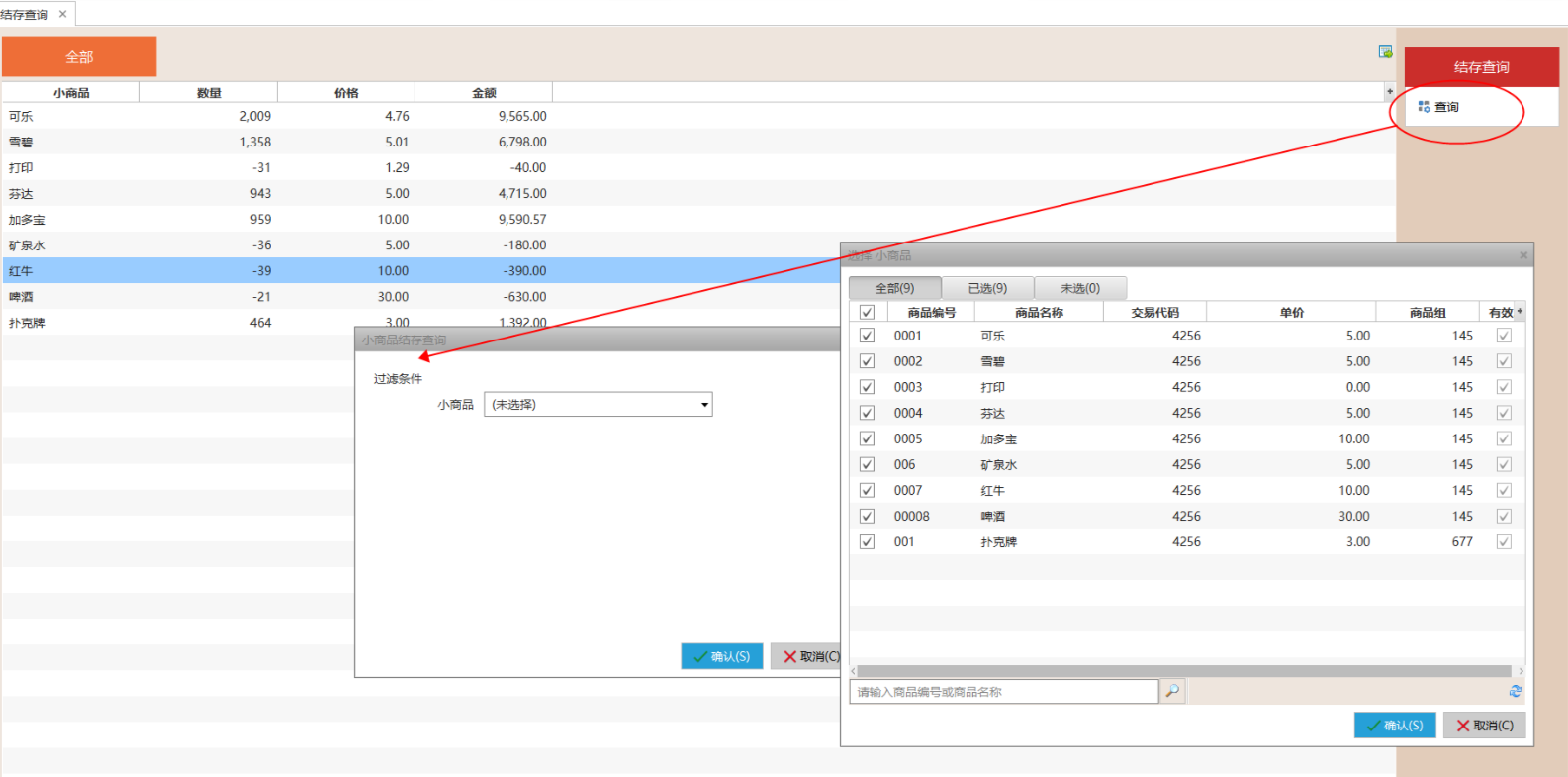 查询条件为:小商品,默认为全部;查询的是库存有结存的物资。