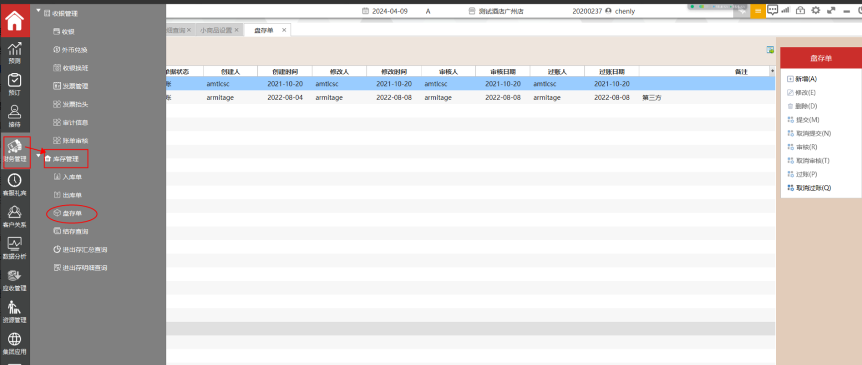 进入财务管理下的库存管理,选取“盘存单”菜单,即可新增盘存单,盘存单里会体现仓库中所有物品的账面数量,操作人员输入实际的实存数量后,系统会自动计算出差异数量和差异金额。同时也可以对盘存单进行修改、删除、审核及过账等操作。 注意:盘存单必须过账才影响小商品的库存变化,同时相关报表才体现出库数量。