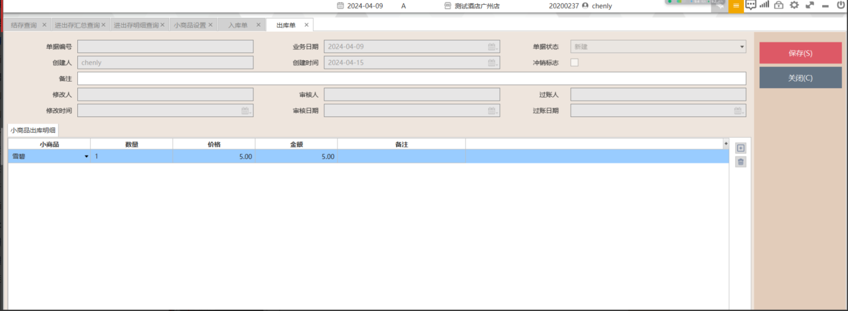 每一笔新增记录都自动生成一张出库单,并在出库单的备注中记录:房号、姓名、帐号、的备注,自动生成的出库单默认为已过账。