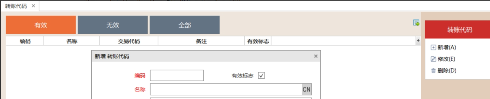 登录ipms组织单元-资源管理 -财务类代码-转账代码-新增