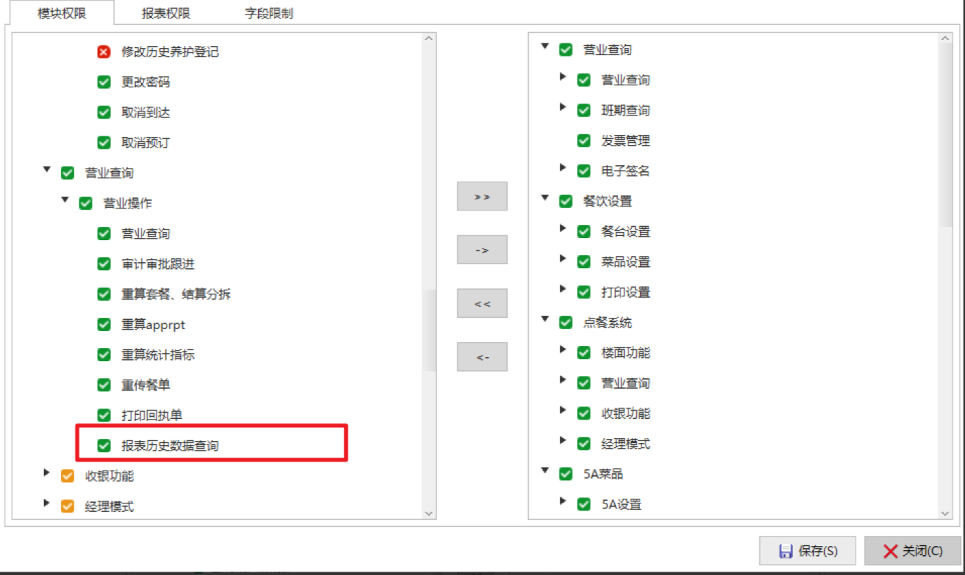 此功能是个报表查询条件的权限控制,主要是控制点菜系统中的部分报表的营业日期查询条件的选择,如果没有此权限只能看当天数据,有则可以查看历史日期的数据。