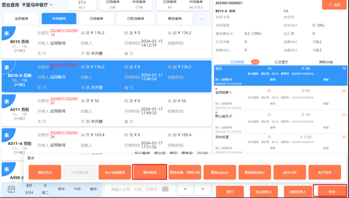 在营业点显示区域界面,点击“营业查询”按钮进入查询界面,点击餐单明细中的“更多”按钮,在展开的界面中选择“重算餐单”按钮。