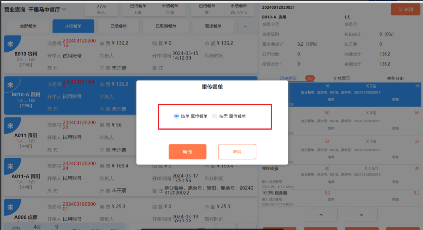 1.当天某张餐单的重传 2.当天内所有餐单进行重传