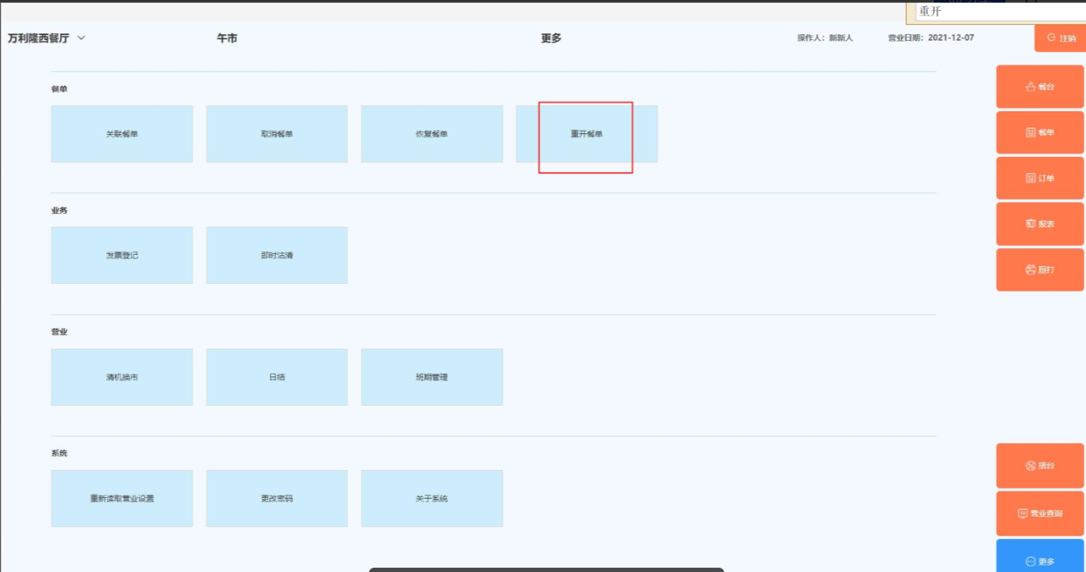 在台态图的更多功能选择“重开餐单”,系统出现如下图,选择指定的餐单,