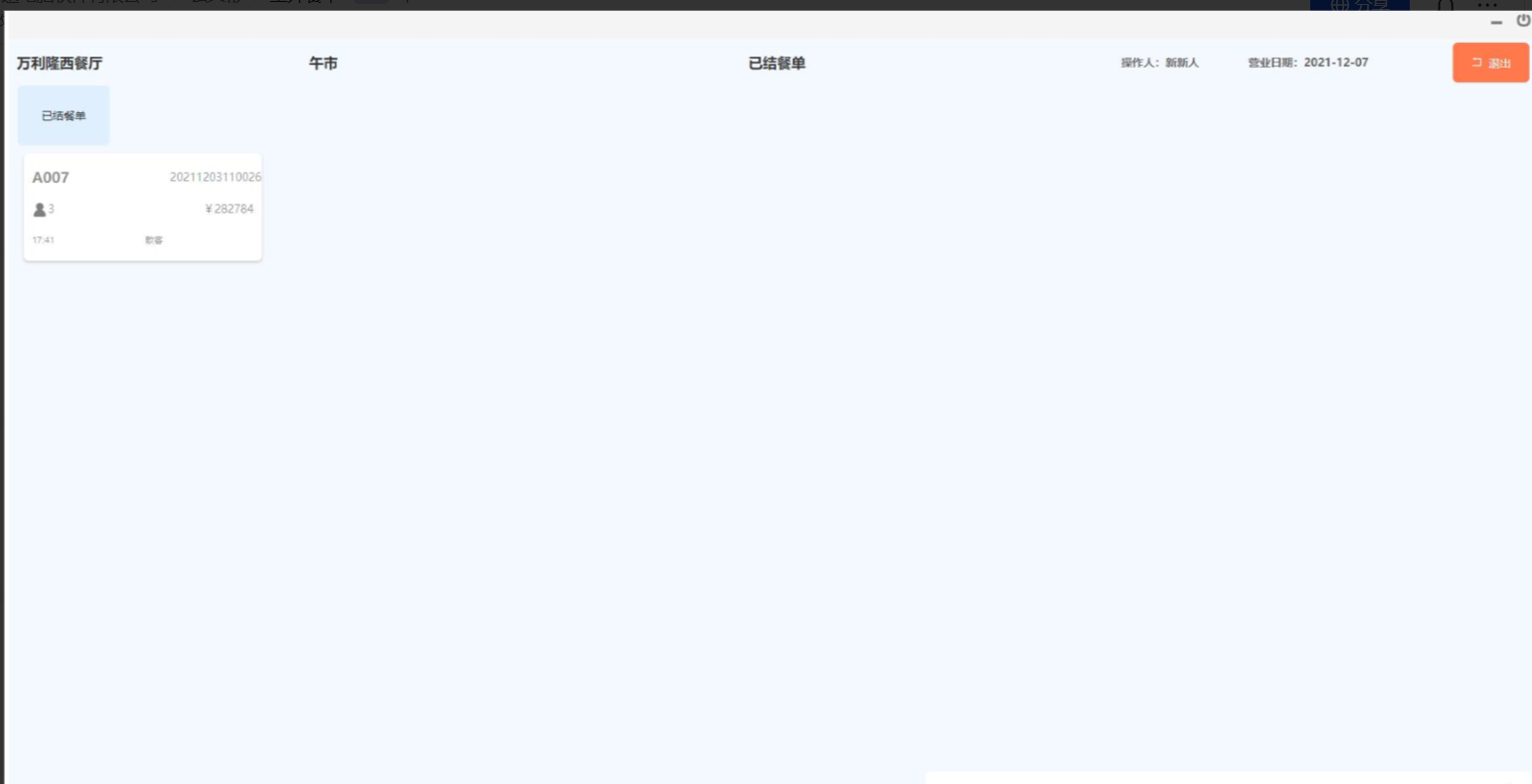 业务说明: 对本市(本班次)已结帐的餐单重开,这个需要权限控制。 操作步骤: 在台态图的更多功能选择“重开餐单”,系统出现如下图,选择指定的餐单, 进入原单的点菜收银页面,接着的操作与新开单相同。