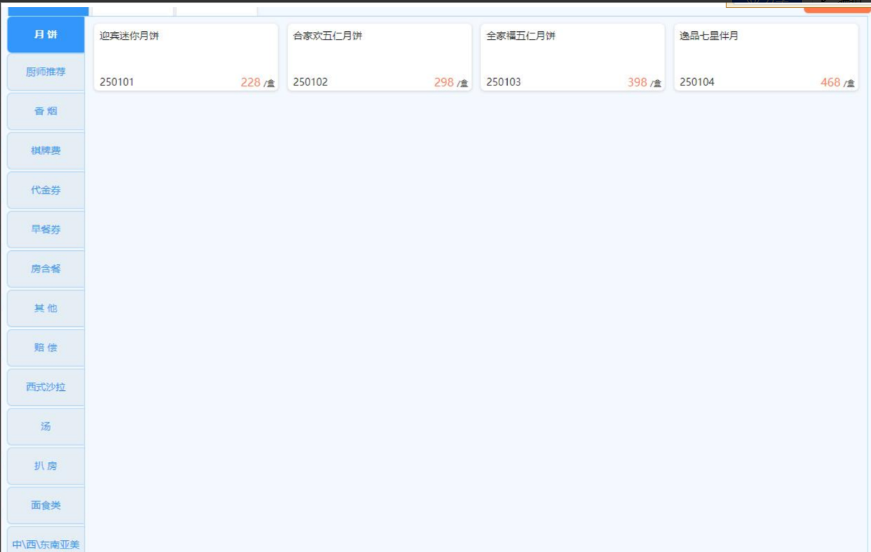 区域 1 菜谱一级类:列出餐厅菜谱分类,分为中厨、明档、酒水类、海鲜类、中点、味