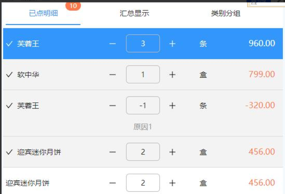 来应收客人 13 元,却输错单价为 15 元,等等诸如此类的问题,都可在落单后用“冲减”