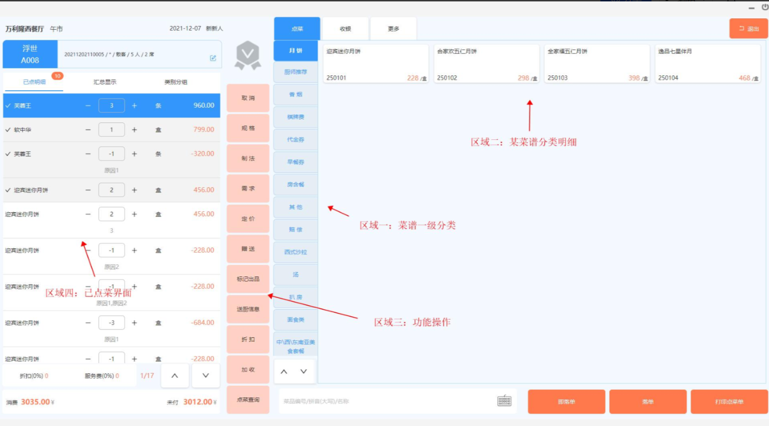 区域 2 为菜品明细一页屏幕 30 个菜以上,超过屏幕的菜可按前后键翻页。如果选择时