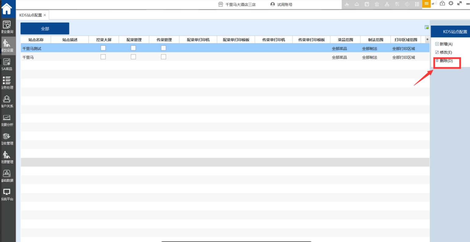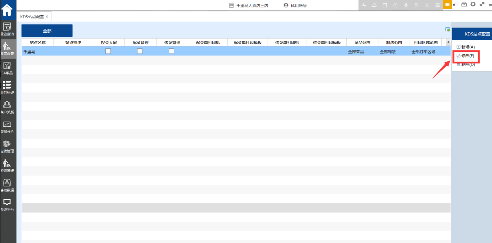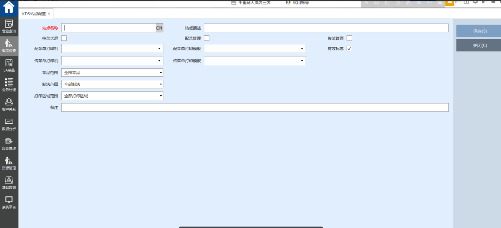 点击右侧新增按钮,填写站点名称,对应的点菜机、菜品范围、制法范围、打印区域范围,点击保存