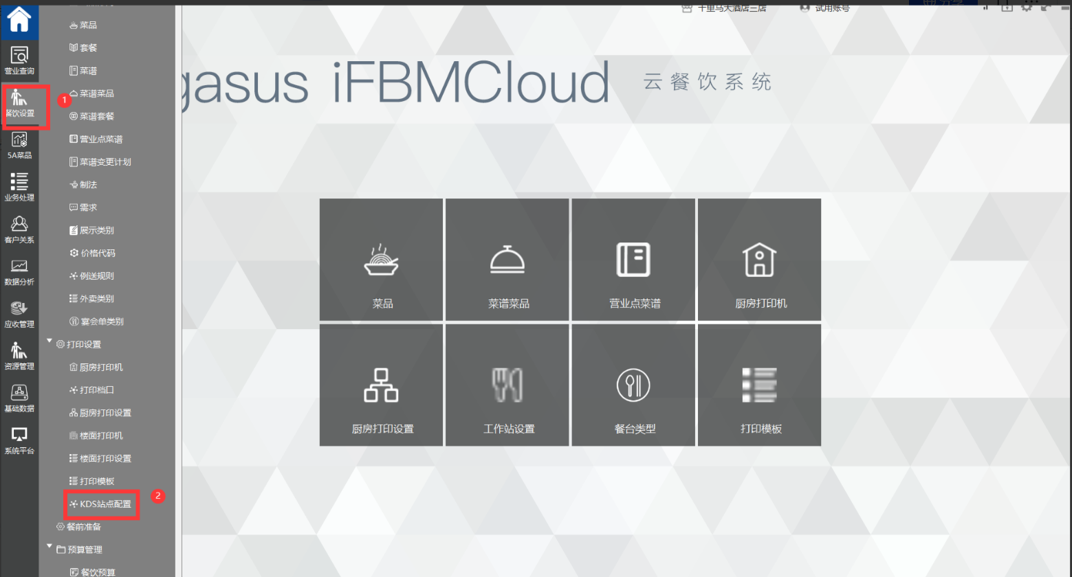 1、使用管理员账号登录IFBMCloud餐饮后台管理系统,点击左侧餐饮设置,下划找到KDS站点配置