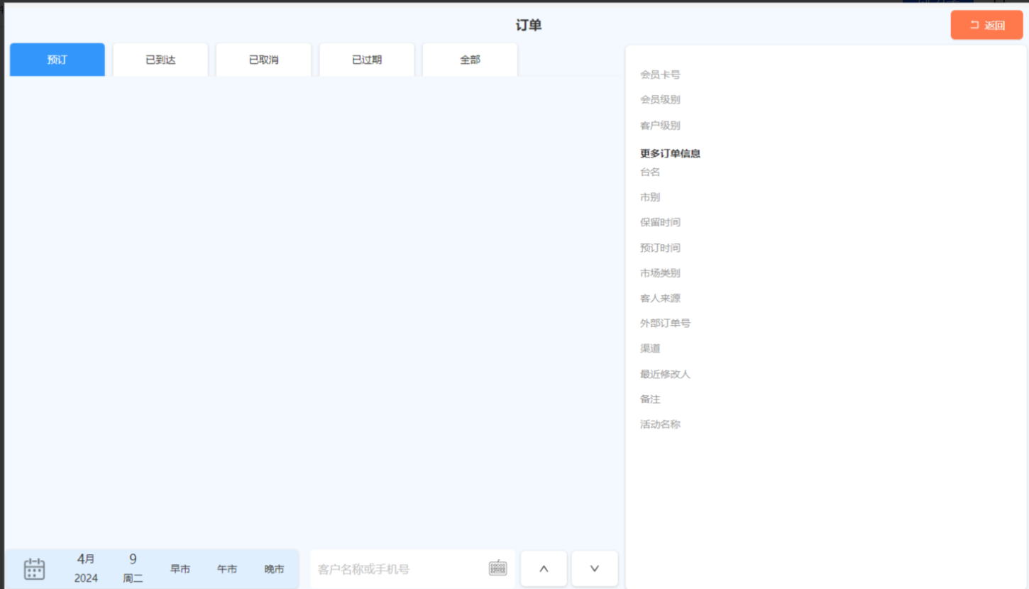 在营业点显示区域界面,点击“订单”按钮进入预订单管理界面,可看到“取消预订”按钮。