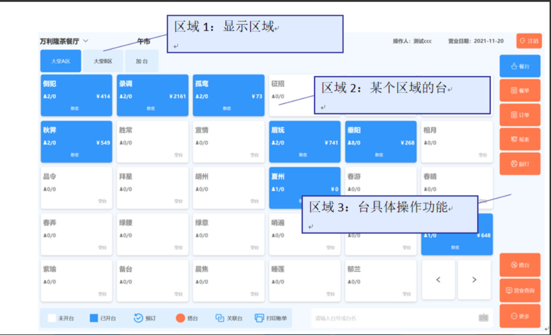 显示区域:系统可以按餐厅的布局对餐台区域进行划分,如可按楼层划分、按房厅划分。并且支持临时加台功能。
