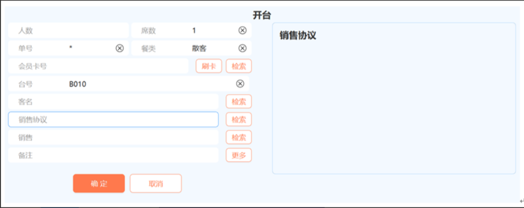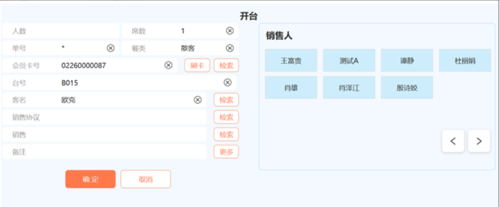 销售:选择销售人员,会员有维护销售员的,餐饮输入会员号带出销售人员。
