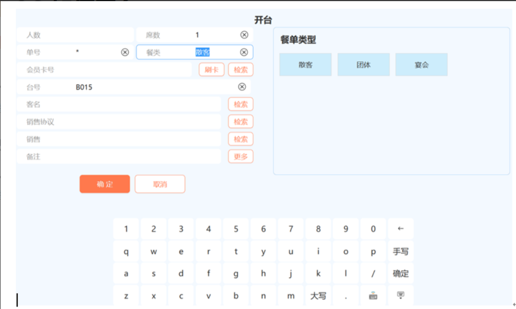 单击某张空台,系统会出现如下图,用户利用界面右框的小键盘输入人数、餐单号、席数、台号。