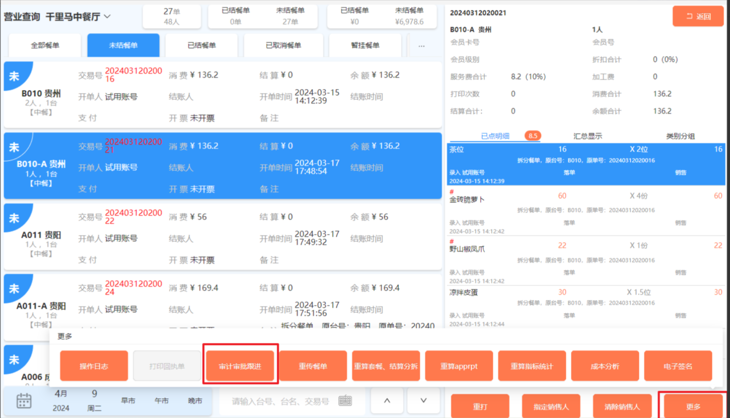 在营业点显示区域界面,点击“营业查询”按钮进入查询界面,点击餐单明细中的“更多”按钮,在展开的界面中选择“审计审批跟进”按钮。