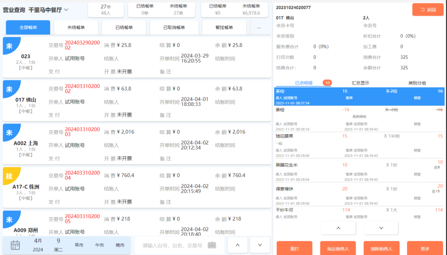 1 功能简述可以查看各营业点的点餐明细以及开台数、已结金额、餐单状态等数据展示。2 功能入口在营业点显示区域界面,点击“营业查询”按钮进入查询界面3 场景操作指引此界面可以查到当前营业日期以及历史日期的餐单点餐明细,以及餐厅经营的一些相关数据。