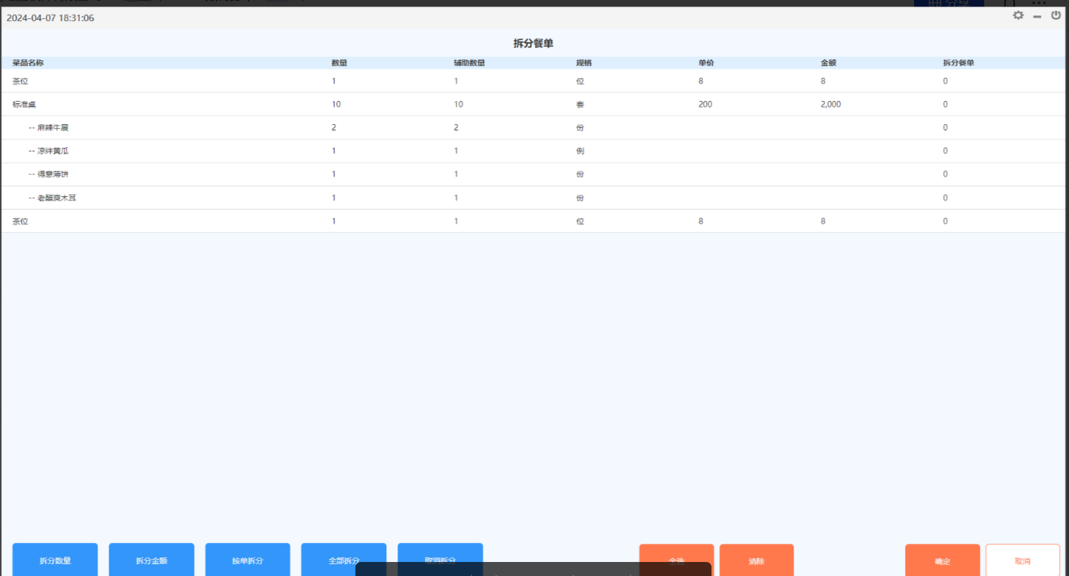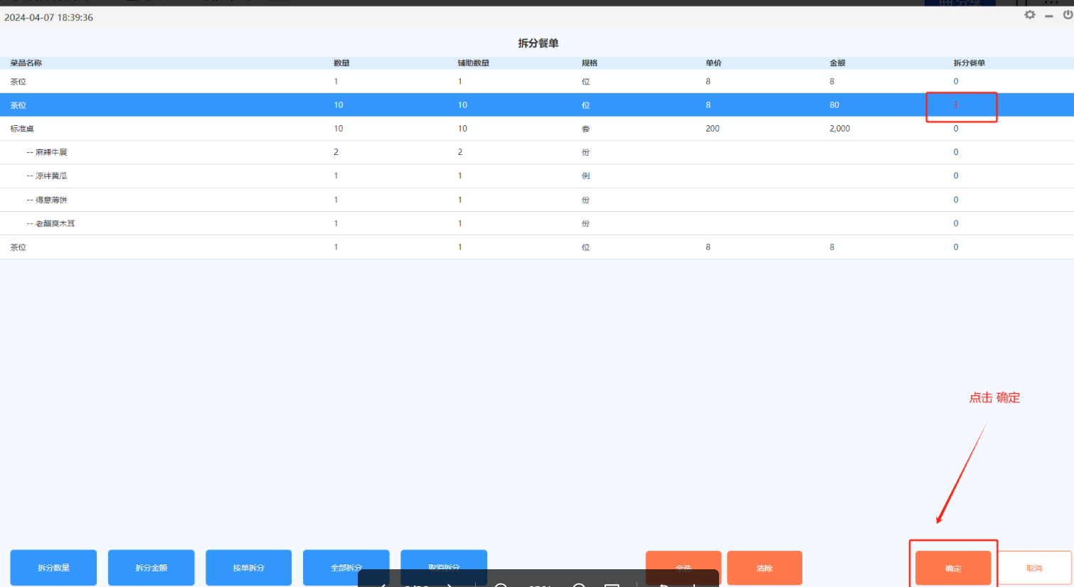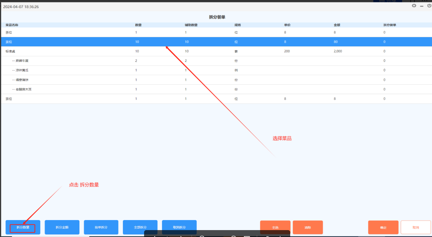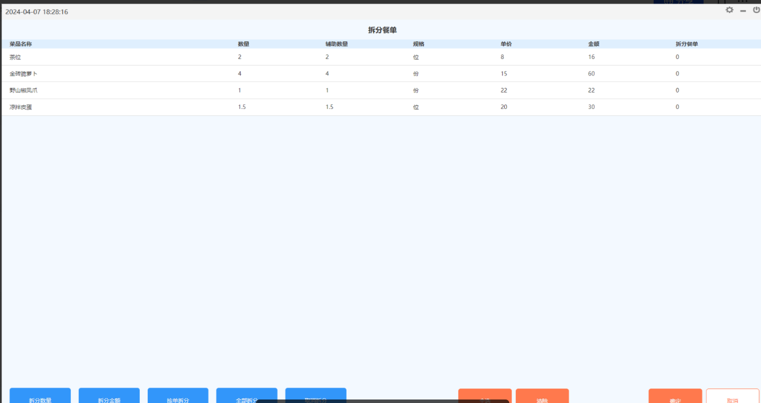 拆分方法: 拆分数量:按所选择的菜品的数量拆分;