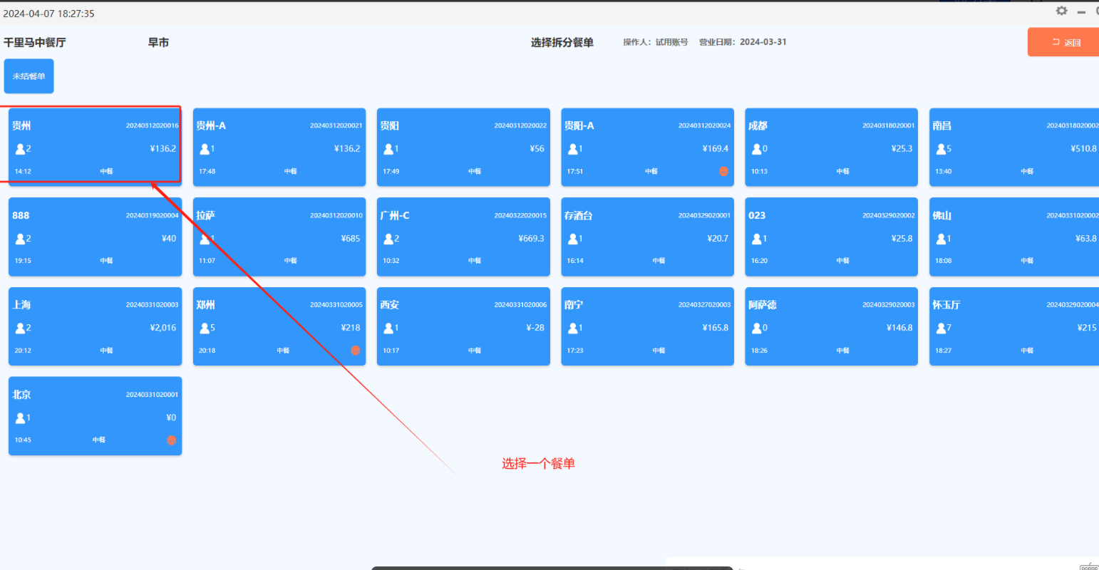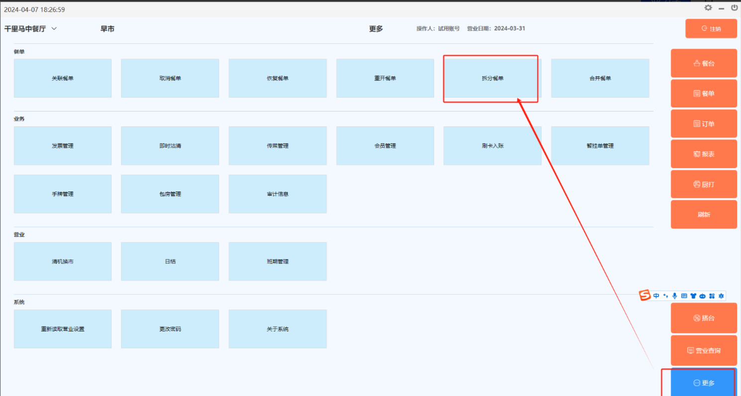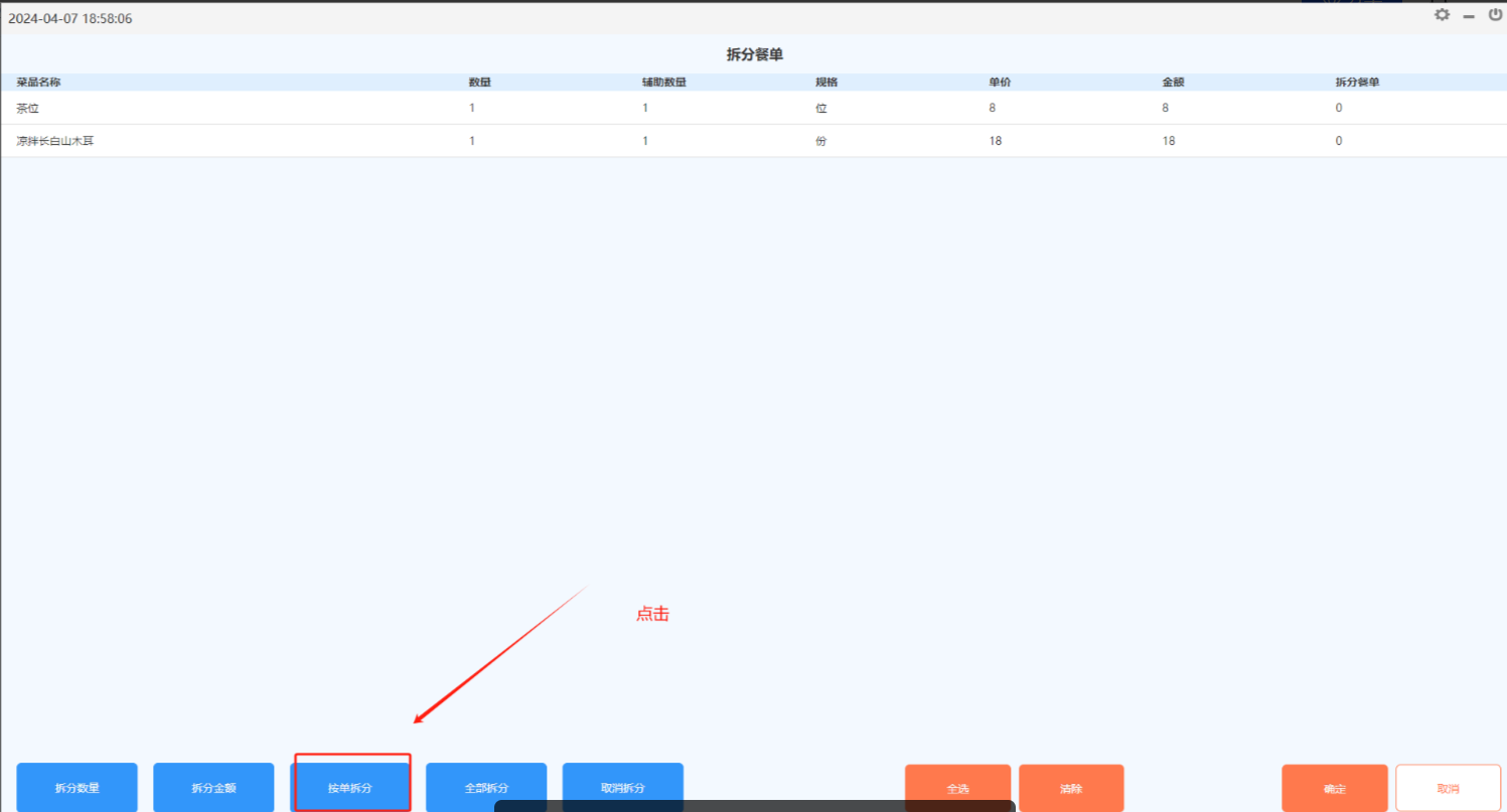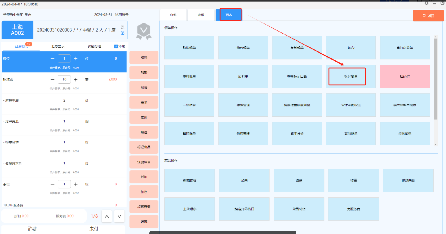 方法一:在台态图的“更多”功能中选择“拆分餐单”,然后选择某张餐单。